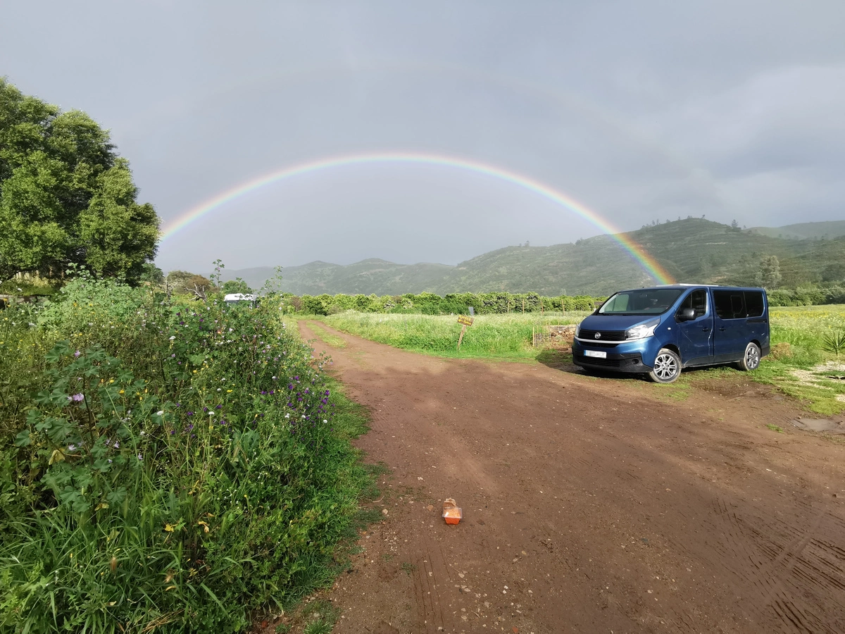 Die Nacht nach dem Flug, hab ich auf dem Pingo Doce Parkplatz in Lagos verbracht – ab 22 Uhr sehr ruhig und morgens gleich Frühstück und Toiletten vor Ort. Am nächsten Morgen nochmal kurz auf dem Flugplatz vorbei gesehen und dann geschaut, wo es hingehen könnte. Zuerst stand ich vor „Cristaland“, aber das war mir dann von der Beschreibung her ein wenig zu spirituell angehaucht. Also „Orange Eco Land“ ins Navi eingetippt und los. Gut, dass ich unterwegs auf ein Schild „fresh Orange Juice“ reagiert habe, sonst wäre ich glatt vorbeigefahren. Mein Navi meinte nämlich, es wären noch 15 Kilometer…