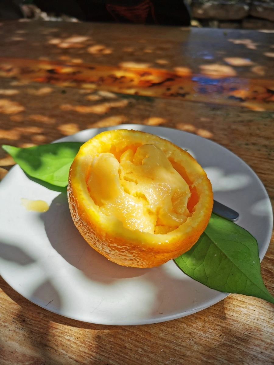 Glücklicherweise wurde im Zeitraum meines Aufenthalts an der Kreation eines Orangeneises gearbeitet – sehr lecker! 🍊🍦Leider hab ich das Foto vom Orangeneis ein wenig versaut – die schöne Orangenblütendeko lag auf der anderen Seite. Leider war es für ein zweites Foto zu spät… 😇 😋